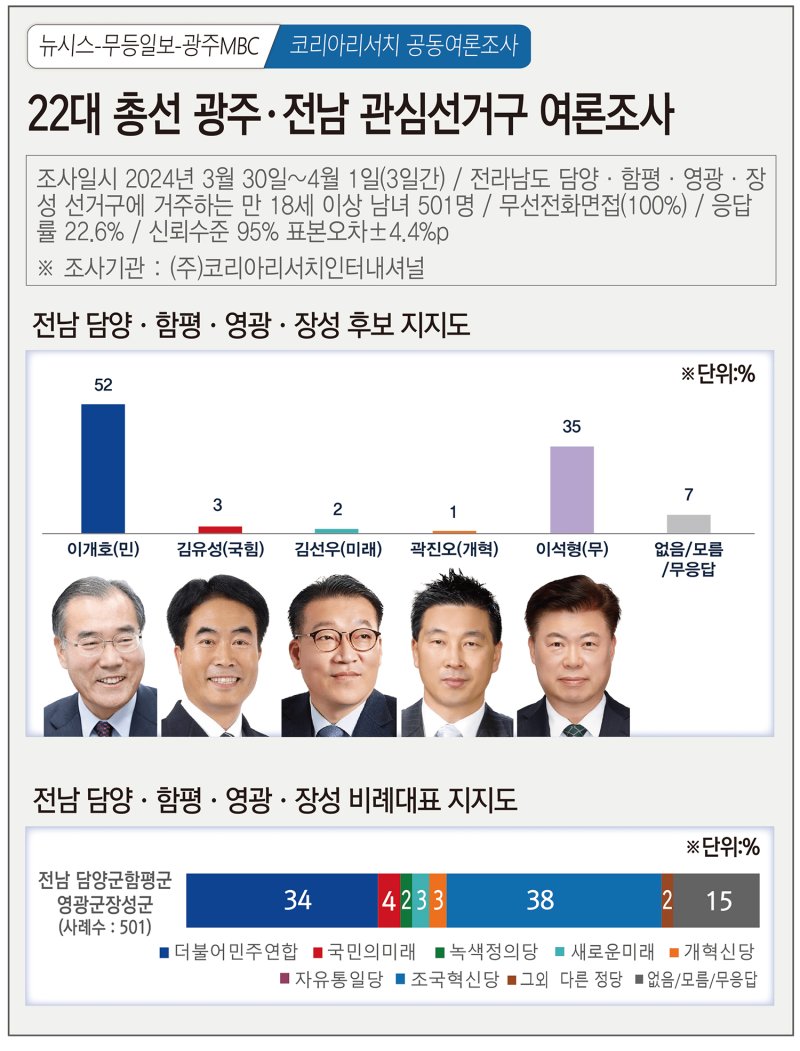 뉴시스 광주전남본부와 무등일보, 광주MBC가 제22대 총선을 앞두고 코리아리서치인터내셔널에 의뢰해 지난달 30일부터 지난 1일까지 사흘 간 전남 광주 담양·함평·영광·장성 선거구에 거주하는 만18세 이상 유권자 501명을 대상으로 제22대 총선 여론조사를 실시한 결과 이같이 나타났다.