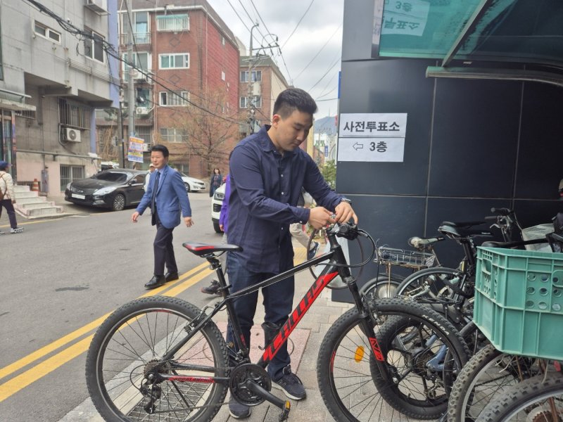 22대 국회의원 선거 사전투표 첫날인 5일 낮 12시께 인천시 계양구 계양2동 행정복지센터 자전거 주차대에는 정운호 씨(25)가 급하게 자전거에 자물쇠를 채우고 있다.