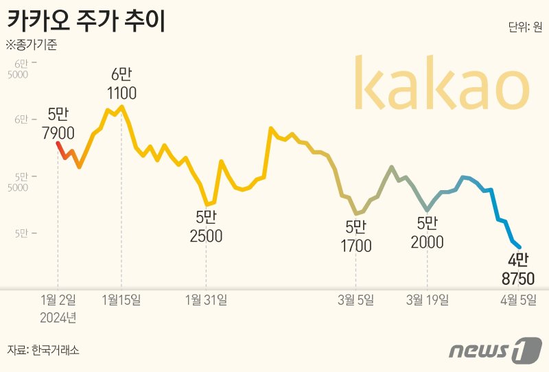 6일 한국거래소에 따르면 전날 카카오는 전 거래일 대비 550원(1.12%) 내린 4만 8750원에 거래를 마쳤다. 주가는 지난 4일 약 4개월 만에 처음으로 5만 원선 밑으로 내려온 데 이어 전날 추가 하락했다.