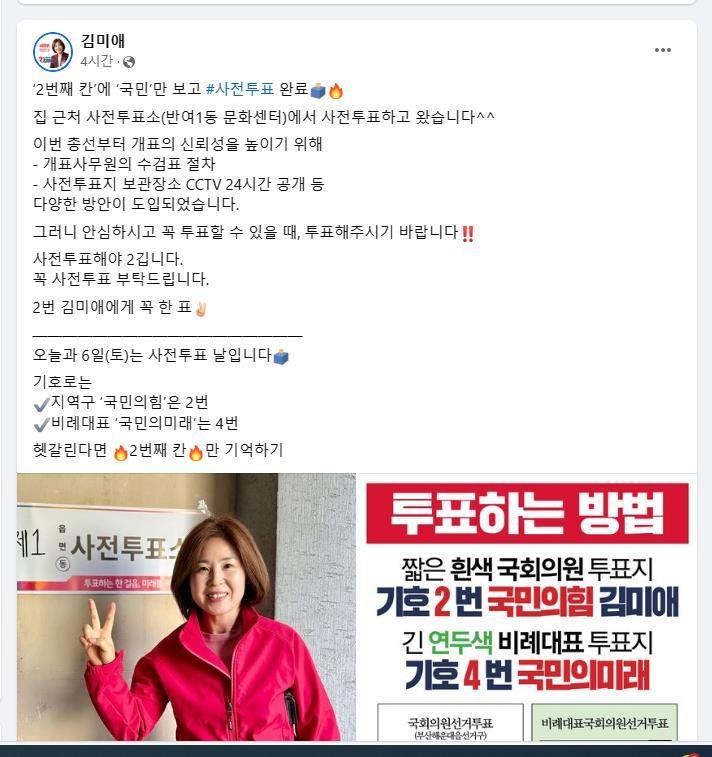 이날 윤 후보측에 따르면 김 후보는 사전투표가 시작되기 전 자신의 페이스북과 블로그 등 각종 SNS에 투표를 독려하는 웹자보를 올렸다. 웹자보에는 비례대표 투표지에 국민의힘 위성정당인 기호 4번 국민의미래에도 투표할 것을 당부하는 글이 포함돼 있다.