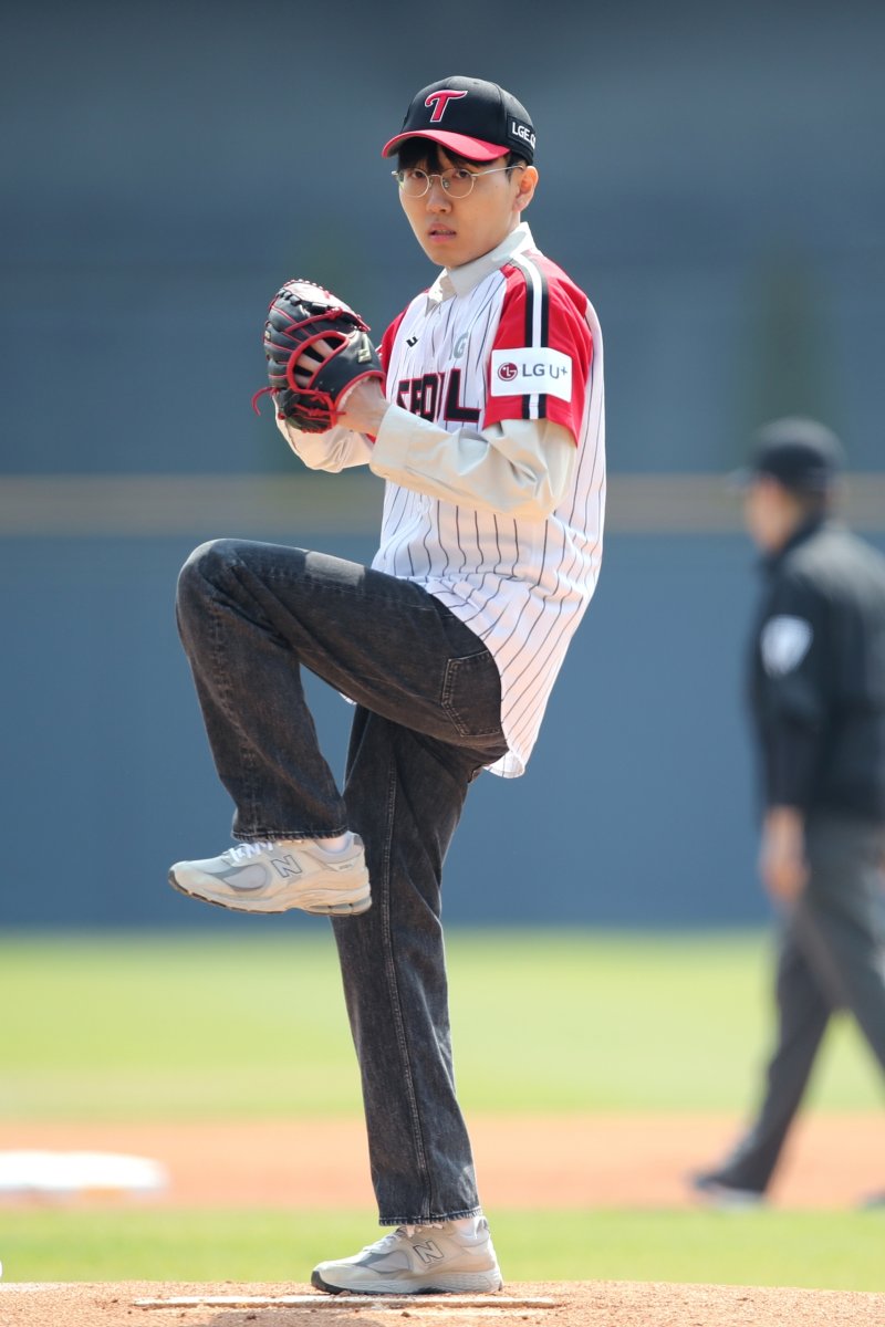 경기 전 LG 투수 이지강의 코칭을 받은 신진서 9단은 등번호 3번을 새긴 유니폼을 입고 마운드에 올라 생애 첫 시구를 했다.