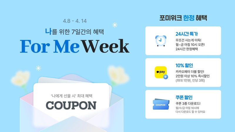 이벤트 기간 월, 수, 금요일 오전 10시에 구매 금액별로 사용할 수 있는 2천원, 10% 할인 쿠폰 등 총 3종의 쿠폰을 지급하며, 매일 오전 10시 '24시간 특가 이벤트'도 열린다. 카카오페이[377300] 머니 또는 카드로 결제 시 1인당 최대 3회까지 추가 10% 할인(최대 1만원 할인)되는 결제 혜택도 제공한다