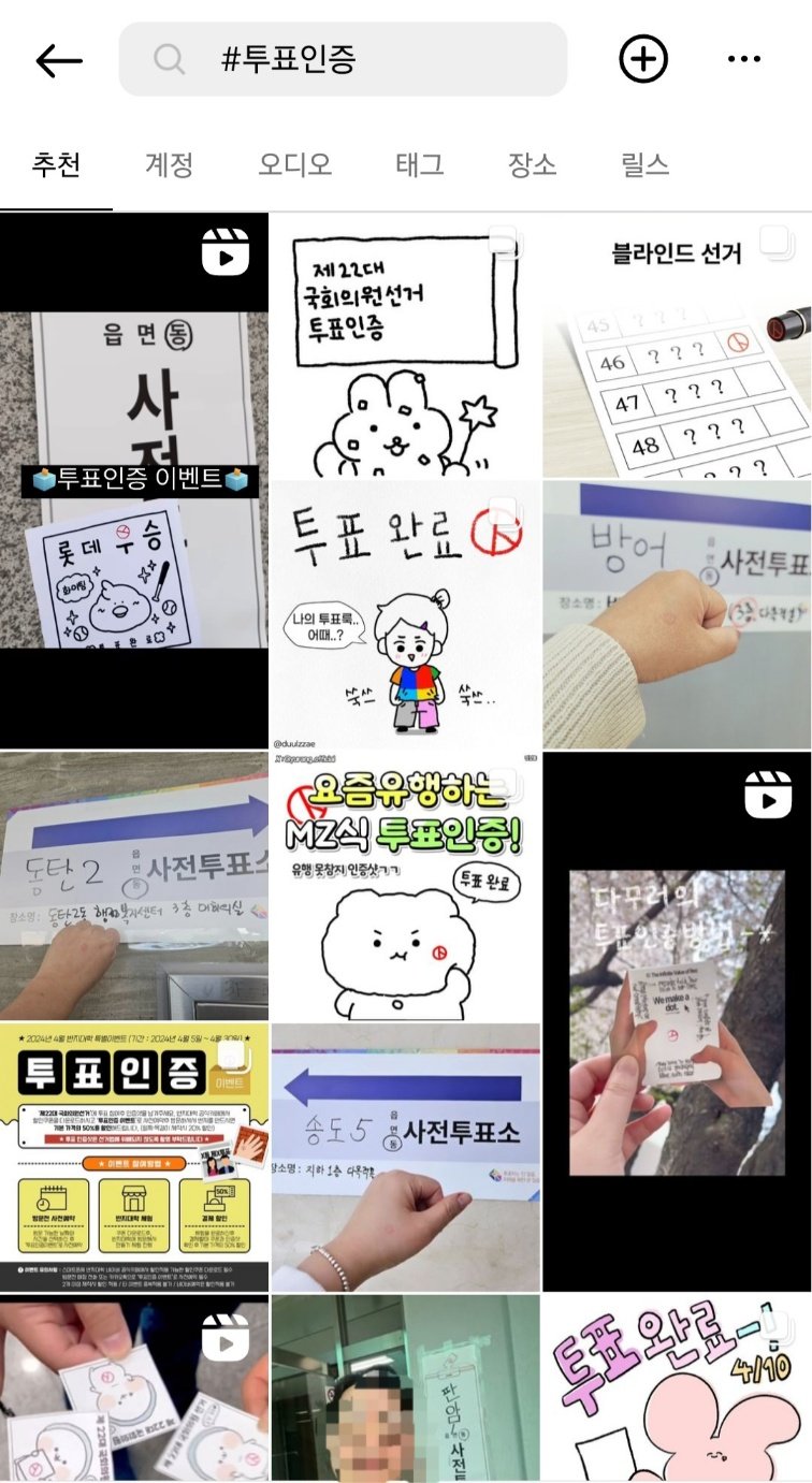 엄지를 치켜세우거나 V 모양 손동작으로 자신이 찍은 후보를 적극 표현하는 유권자들이 있는가 하면, 파란색이나 빨간색 상의를 착용한 모습을 올려 지지 정당을 우회적으로 드러내는 이들도 있었다. 투표에 동행한 반려견이나 자녀의 손등에 인증샷을 남긴 이들도 있었다.