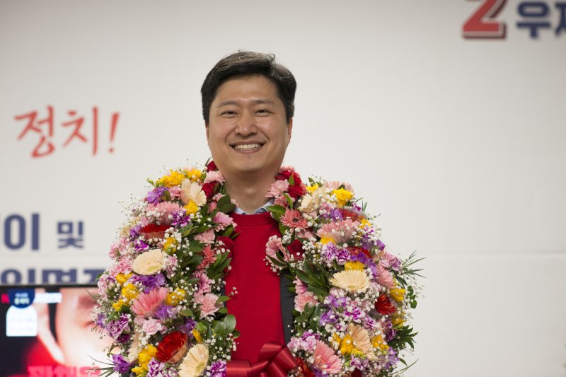 당선이 확정되자 우 후보는 지지자들에게 인사를 한 뒤 꽃다발을 목에 걸고 승리를 자축했다.