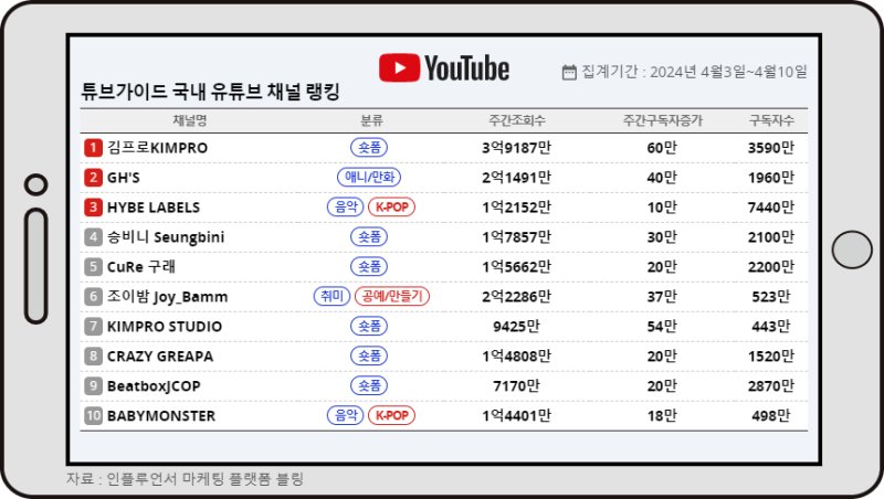 11일 튜브가이드는 인플루언서 마케팅 플랫폼 '블링'의 구독자수·조회수 데이터를 기반으로 산정한 4월 둘째주 국내 유튜브 채널 차트를 발표했다.