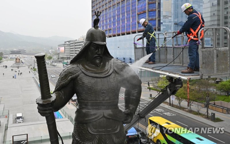 (서울=연합뉴스) 최윤선 기자 = 광화문광장의 세종대왕 동상과 이순신 장군 동상이 겨우내 쌓인 미세먼지와 묵은 때를 벗겨낸다.