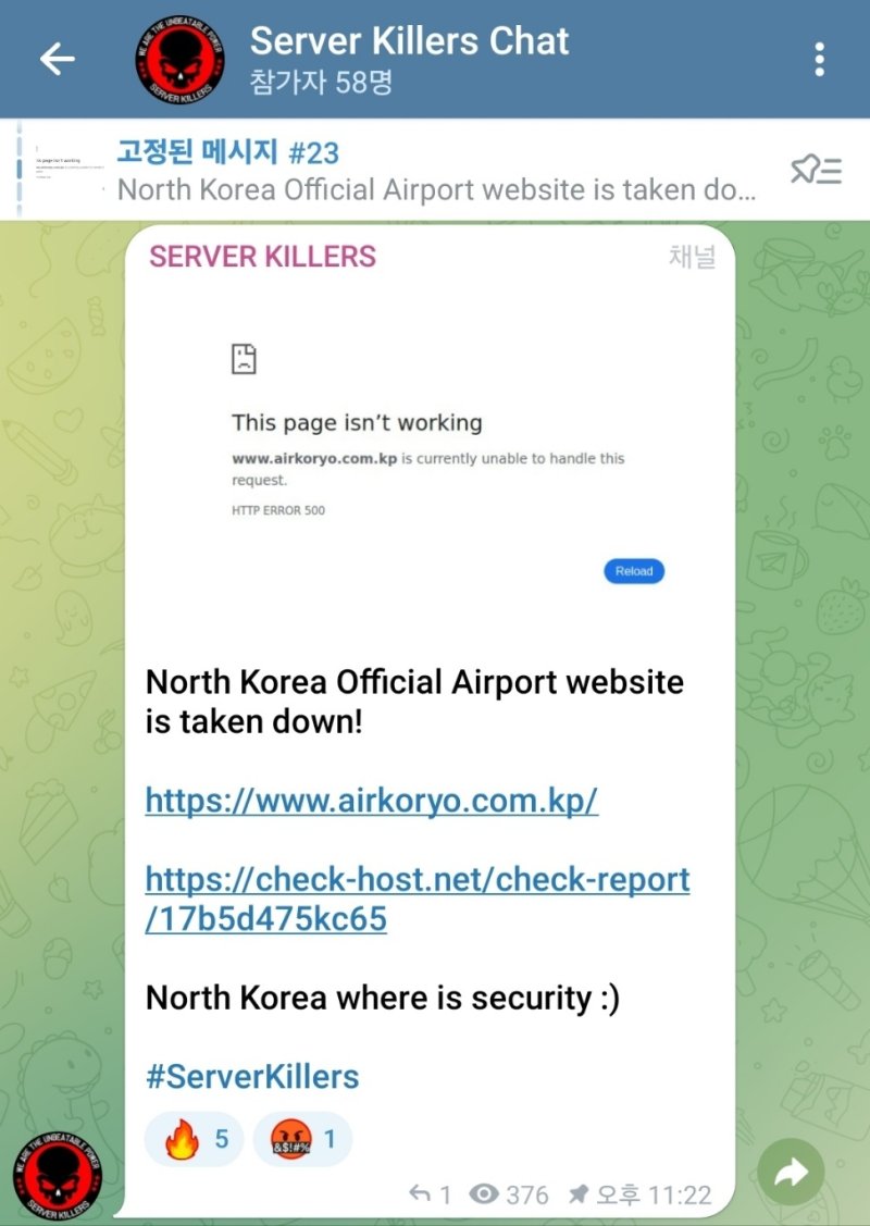 12일 자유아시아방송(RFA)에 따르면 해킹조직 '서버 킬러즈'(Server Killers)는 지난 9일 텔레그램에 '이 페이지는 작동하지 않습니다' 등 오류 메시지가 적힌 고려항공 홈페이지 화면 사진을 싣고 자신들이 해킹했다고 밝혔다.