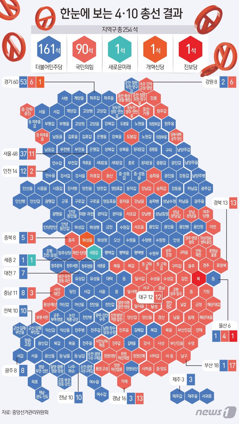 (서울=뉴스1) 신윤하 기자 = 매 선거에서 민심의 바로미터 역할을 한 수도권·충청은 4·10 총선에서 더불어민주당의 손을 들어줬다. 지난 대통령 선거와 지방선거에서 국민의힘에 지지를 보냈던 수도권과 충청의 민심이 돌아섰단 해석이 나온다.