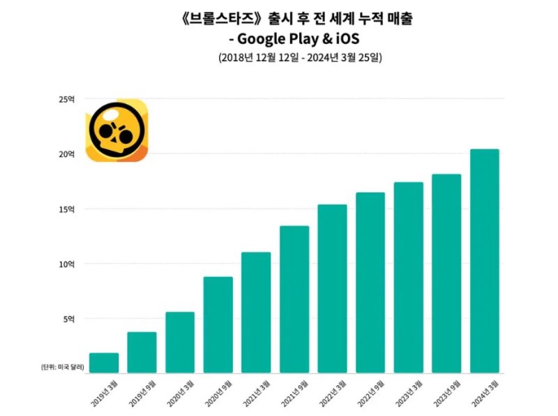 센서타워에 따르면 브롤스타즈는 2018년 말에 출시돼 지난달 기준으로 전 세계 누적 매출액 20억달러(2조7670억)을 달성했다. 국가별 매출 비중을 보면 미국이 16.7% 1위 한국은 11.9%로 2위를 차지하고 있다.