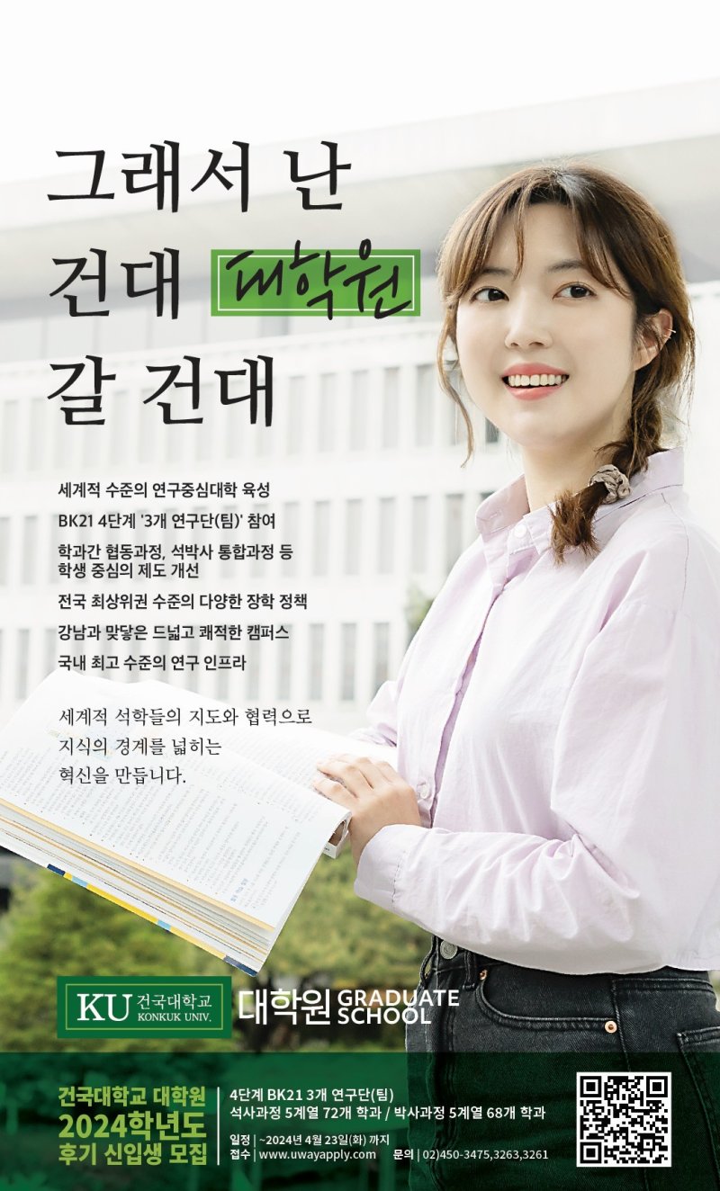 (서울=뉴스1) 권형진 기자 = 건국대학교는 일반대학원과 전문·특수 대학원이 2024학년도 후기 석·박사 과정 신입생을 23일까지 모집한다고 17일 밝혔다.