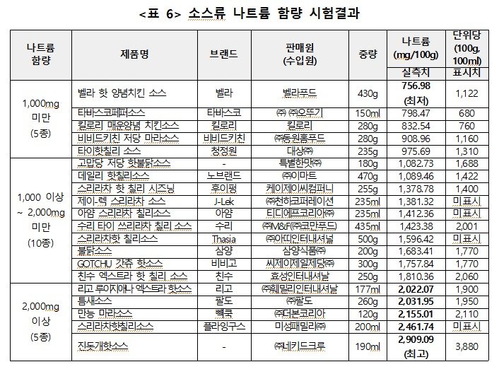 나트륨 함량 차이도 컸다. '벨라 핫 양념치킨 소스'의 나트륨 함량은 756.98mg로 비교적 낮았지만, '진돗개핫소스'는 함량이 무려 2909.09mg에 달했다. 약 51배 차이로, 세계보건기구(WHO)의 일일 나트륨 권장 섭취량(2000mg)도 훌쩍 뛰어넘는 수준이다.