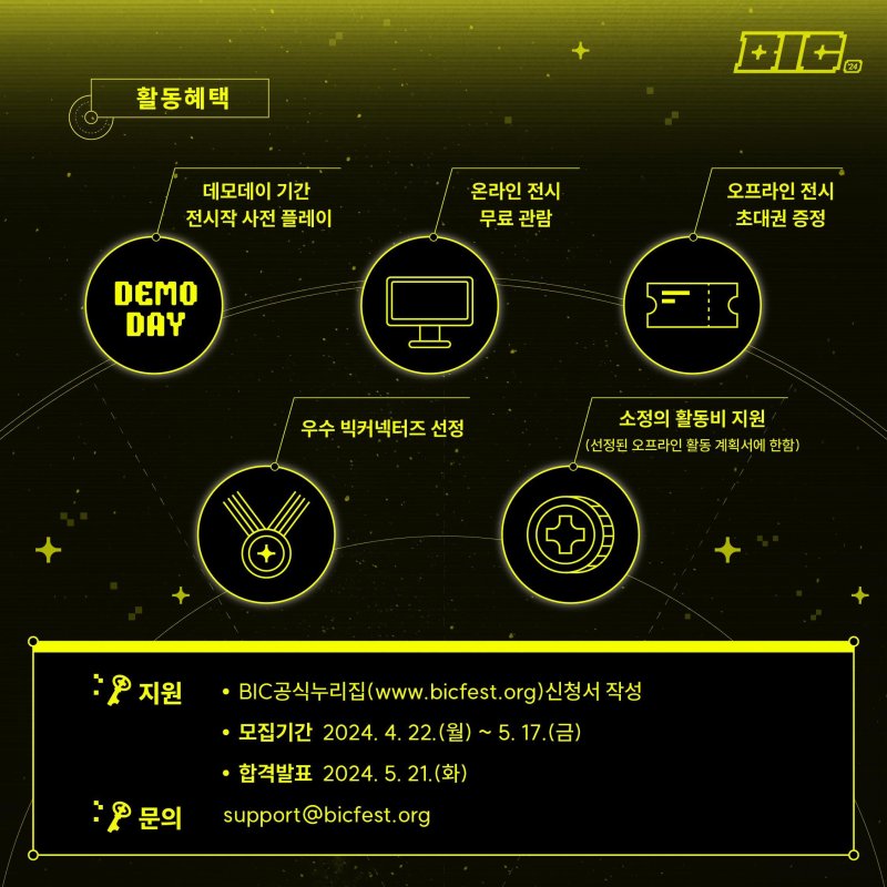 모집 기간은 5월 17일 오후 6시까지며 인디게임을 사랑하는 만 14세 이상이라면 누구나 지원할 수 있다. 단 BIC 2024 인디게임 신청자는 제외다.