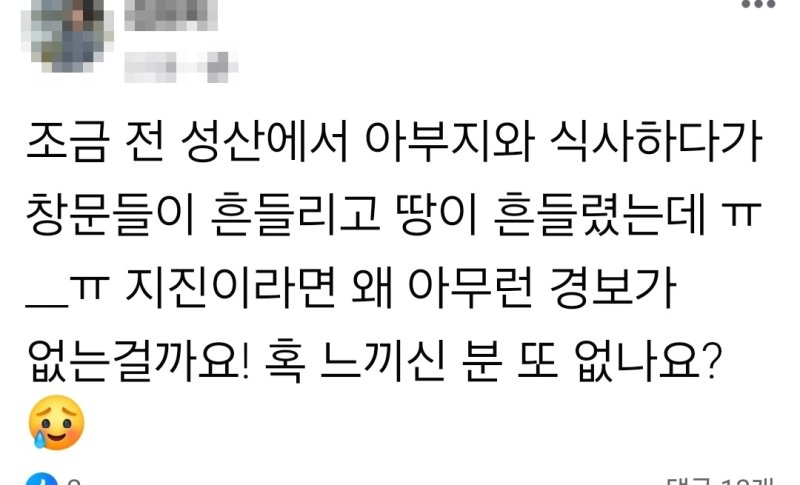 이날 오전 SNS 등에 '아버지와 식사 중 창문이 흔들리고 땅이 흔들렸다', '저도 느꼈다.