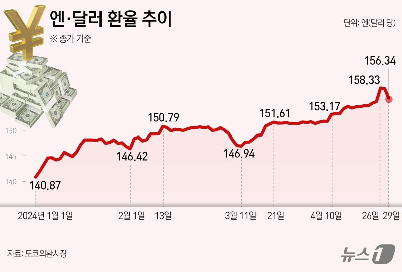이날 아시아 외환시장 오전 달러당 160엔 초반까지 급락한 엔화 가치는 그날 오후 1시께부터 떨어지기 시작해 155.01엔까지 약 5엔 하락(가치 상승)했다.