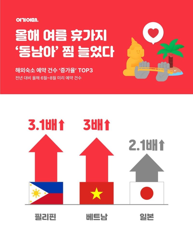 여기어때 관계자는 "일본의 예약 건수는 2.1배 이상 증가한 반면 동남아 국가들은 3배 이상 성장하며 인기 여행지로 부상했다"고 설명했다.