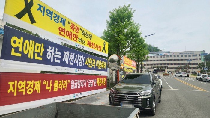 현수막에는 지역경제 상황을 빗대 "연애만 하는 제천시장 시민과 이혼해라", "지역경제 나 몰라라 얼굴 알리기 급급한 제천시장", "지역경제 폭망하는데 연애만 하는 제천시장" 등 원색적인 내용이 적혔다.