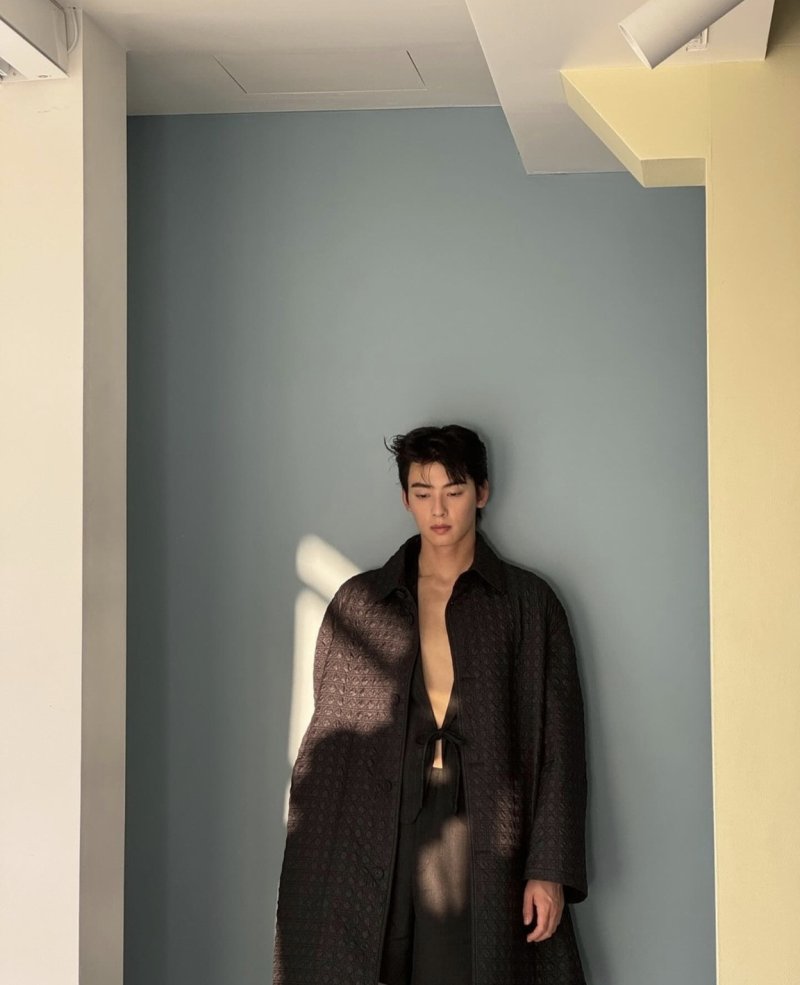 사진 속 차은우는 검은 셔츠, 연녹색 자켓 등을 입고 있는 모습이다.