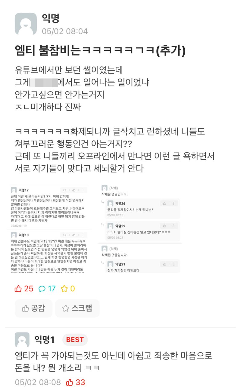 이외에도 "MT 불참으로 인해 과 내 정보가 줄어들거나 친밀도가 낮아지는 것은 본인의 선택 사항이다"며 "불참비를 걷는 것은 불합리하고 부끄러운 일이다"는 등의 반응을 보였다.