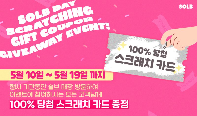 이벤트 기간 동안 솔브 매장을 방문해 신영 통합멤버십에 신규 가입하거나 전환하면 100% 당첨되는 스크래치 카드를 증정한다. 이와 함께 행사 기간 내 솔브 제품을 구매한 경우에도 이벤트 참여가 가능해 솔브 고객이라면 '꽝 없는' 행운의 기회를 잡을 수 있다.
