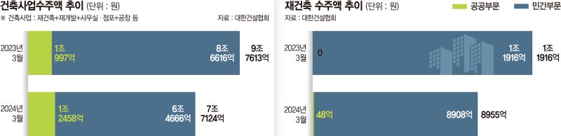특히 재건축 사업의 경우 지난 3월 국내 건설사들이 수주한 총액은 8955억원으로 전년 동기(1조1916억원)에 비해 24.8% 하락했다. 민간부문의 재건축 수주액은 전체 재건축 수주액 중 대부분에 해당하는 8908억원이다. 이는 전년 동월(1조1916억원) 대비 25.2%가 줄어든 수치다. 반면, 공공부문의 경우 전년에는 없었던 수주액이 올해 48억원으로 상승했지만, 민간부문의 부진을 메우기에는 액수가 매우 적었다.
