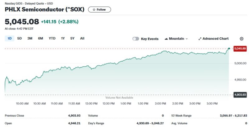 15일(현지시간) 뉴욕증시에서 반도체지수는 전거래일보다 2.88% 급등한 5045.08포인트를 기록했다. 반도체지수가 5000포인트를 재돌파한 것은 지난 3월 7일 이후 처음이다.