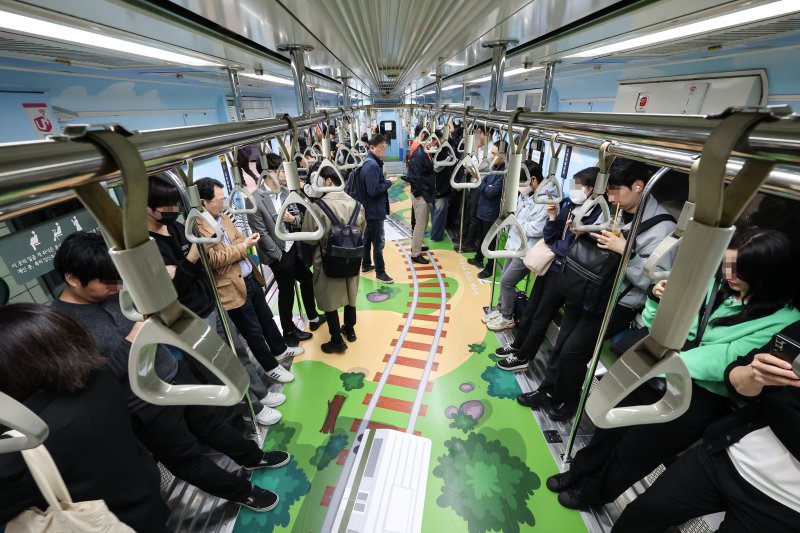 [서울=뉴시스] 김근수 기자 = 16일 오전 서울 지하철 7호선 열차에서 시민들이 출근길에 나서고 있다.서울교통공사는 4호선에 이어 출근시간대 지하철 객실 혼잡도를 개선하기 위해 오늘부터 7호선 객실 열차에도 의자 없는 칸 시범운행을 한다고 밝혔다. 2024.05.16. ks@newsis.com [서울=뉴시스] 이영환 김근수 조현아 기자 = 서울 지하철 4호선에 이어 7호선에서도 16일 출근길부터 '의자 없는 열차'를 운행 한다.