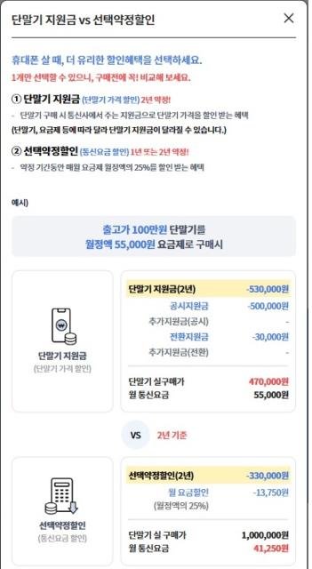 단말 모델과 요금 수준을 선택해 검색할 경우 단말기 지원금과 선택약정 요금할인 간 혜택을 세부적으로 비교해주는 기능도 추가했다.