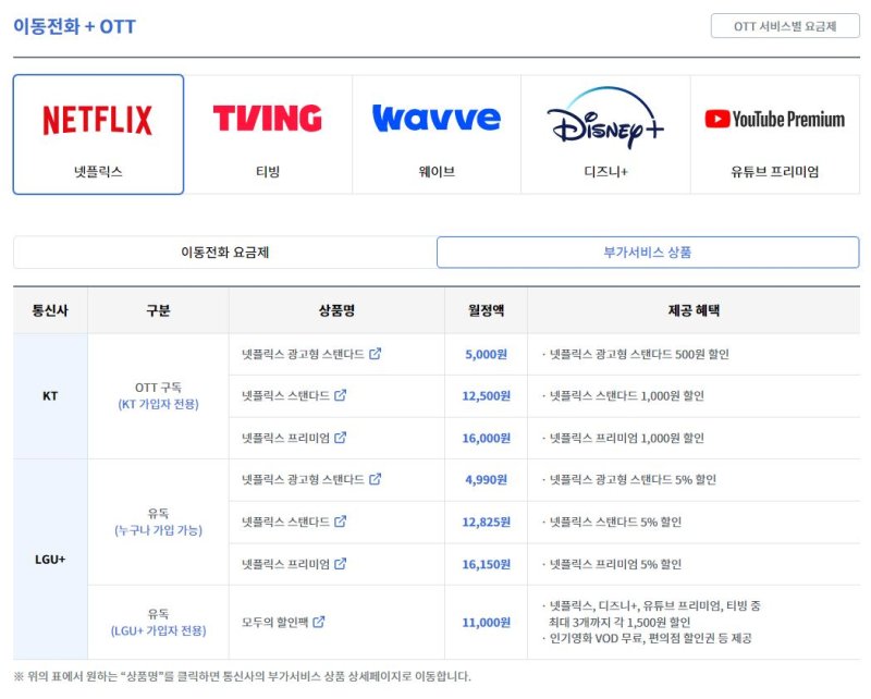 스마트초이스 '요금제 찾기' 메뉴에 'OTT 결합상품' 카테고리가 추가됐다. 넷플릭스, 티빙, 웨이브, 디즈니플러스, 유튜브 프리미엄 등 5개의 OTT 중 하나를 선택하면 해당 OTT 서비스를 결합한 통신사 요금제와 부가서비스 정보를 볼 수 있다.