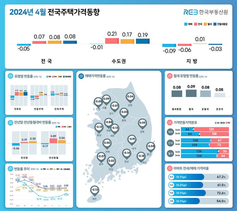 전국 주택종합 매매가격은 0.05% 떨어져 전월대비(-0.12%) 하락폭이 축소됐다. 전국 주택 매매가격은 지난해 12월 하락 전환된 이후 5개월 연속 하락세를 이어갔다. 지방(-0.13%→-0.09%)도 하락폭이 줄어들었다.