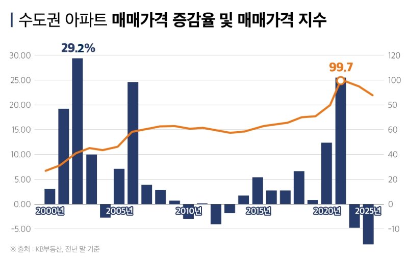 17일 부동산 정보업체 부동산인포가 KB부동산 주택가격동향 자료를 분석한 것에 따르면, 1999년 통계 공개 이래 수도권 집값은 25년 중 18년은 상승하고 7년은 하락했다.