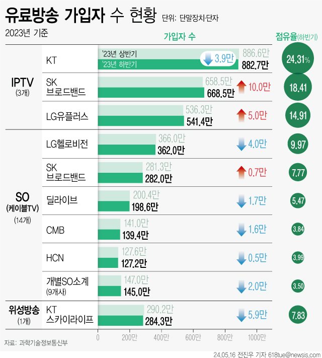 18일 과학기술정보통신부 '2023년도 하반기 유료방송 가입자 수(6개월 평균) 현황'에 따르면 지난해 하반기 유료방송 가입자 수는 3631만106 가입자(단말장치·단자)로 전 반기 대비 0.1% 줄었다. 2015년 하반기 유료방송 가입자 수 조사 이후로 첫 가입자 수 감소다.