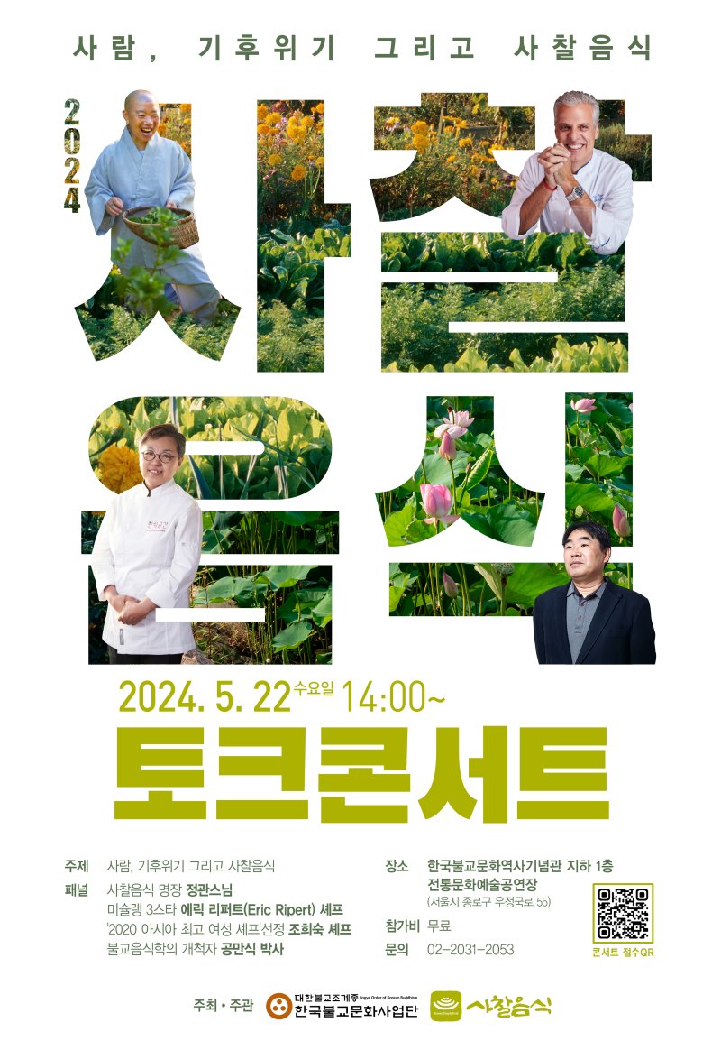 이 토크콘서트에는 정관스님, 에릭 리퍼트, 아시아 최고 여성 셰프 조희숙, 불교음식학 선구자 공만식 박사가 참석한다.