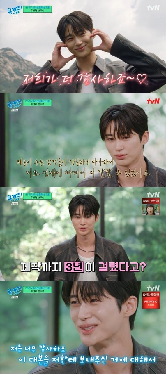 변우석은 제작까지 3년이 걸린 '선업튀' 출연에 대해 "첫 주인공을 맡은 드라마다, 제가 인지도가 많이 있는 편이 아니어서 다른 배우님들한테 먼저 들어갔던 것 같다"라고 비화를 공개했다. 변우석은 "저는 너무 감사하다, 이 대본을 제게 보내주신 것에 대해, 너무 신기하다, 전 읽자마자 무조건 하고 싶었다"라고 덧붙였다.