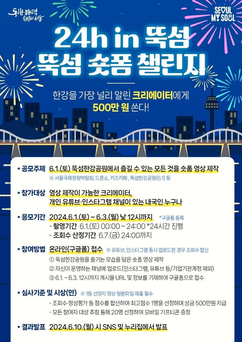 (서울=뉴스1) 박우영 기자 = 서울시는 '건강하고 펀(Fun)하고 힙(Hip)한' 서울의 모습을 알리는 '24h IN 뚝섬, 숏폼 콘텐츠 챌린지'를 개최한다고 23일 밝혔다. 하루에 걸쳐 변화하는 뚝섬한강공원의 모습을 숏폼에 담으면 된다.