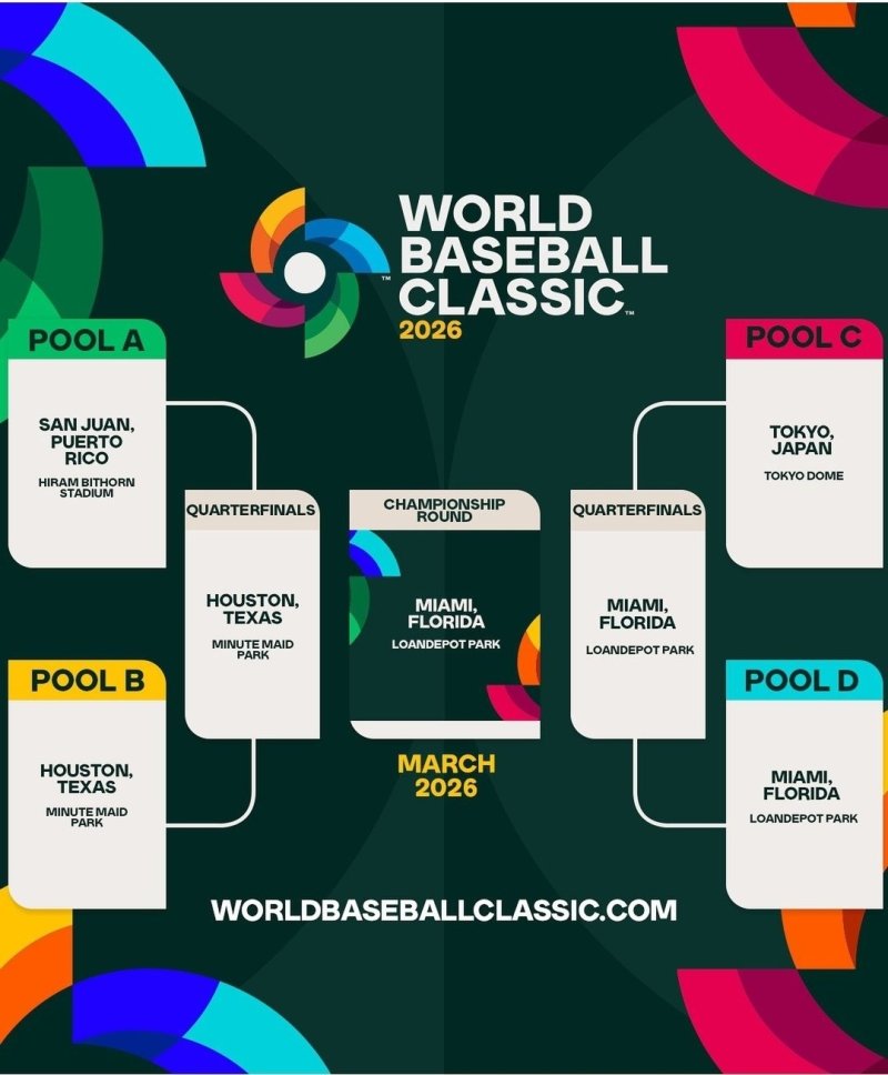 메이저리그(MLB) 사무국은 24일(한국시각) 미국 텍사스주 휴스턴과 플로리다주 마이애미, 일본 도쿄, 푸에르토리코 산후안에서 2026 WBC가 개최된다고 밝혔다.