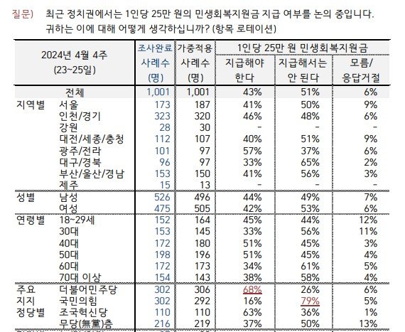 24일 여론조사 전문기관 한국갤럽이 지난 21~23일 3일간 전국 만 18세 이상 1001명에게 민생회복지원금에 대한 찬반을 조사한 결과에 따르면 민생회복지원금을 '지급해야 한다'는 의견이 43%, '지급해서는 안 된다'는 의견이 51%, '모른다'는 의견이 6%를 차지했다.