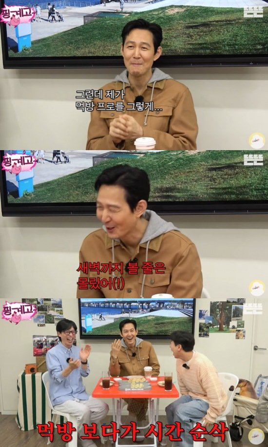 이정재는 "내가 먹방 프로를 새벽까지 볼 줄 몰랐다"며 "어느덧 보면 새벽 3시다. 6시에 일어나서 촬영 가야 하는데 침대에 옆으로 누워 가지고 계속 먹방만 본다"고 웃었다. 이에 양세찬은 "다 똑같구나, 나만 그러는 줄 알았는데"라고 놀라워 했고, 유재석도 "사람 사는 거 다 똑같다"고 말했다.