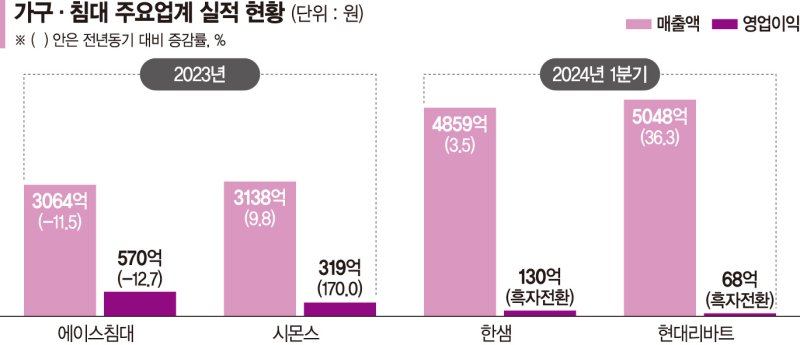 또 가구업체인 현대리바트는 올 1·4분기 역대 최대실적을 갈아 치우며 한 자릿수 매출 성장에 그친 한샘을 제치고 업계 1위에 등극했다. 분기 단위이긴 하지만 가구업계 1, 2위가 바뀐 것은 이례적이란 평가다.