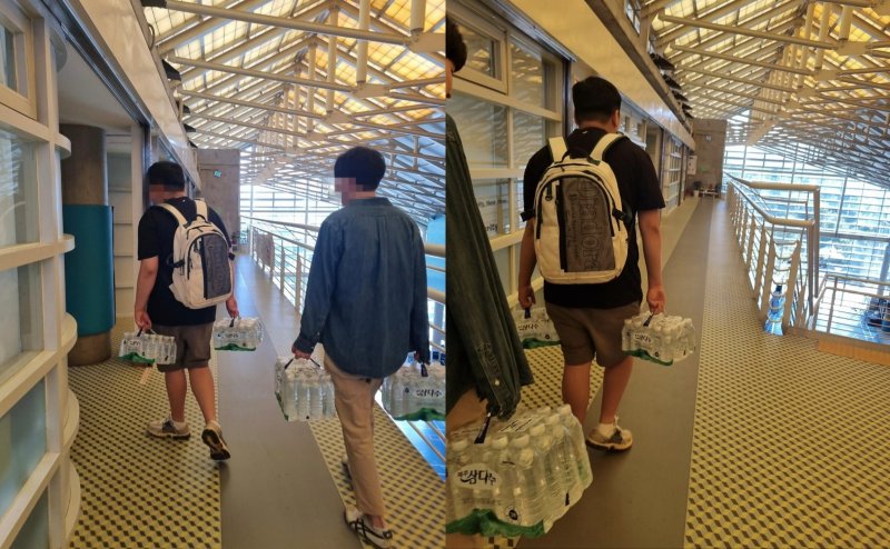 사진 속 송민 군은 무거운 생수병들을 들고 이동 중인 모습이다.