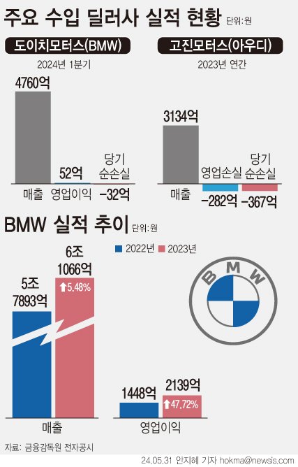 31일 금융감독원 전자공시시스템에 따르면 올해 국내 수입차 판매 1위인 BMW의 주요 딜러사인 도이치모터스는 올 1분기 매출액 4760억원, 영업이익 51억원, 당기순손실 32억원을 보였다. 당기순손실은 일정 회계 기간에 기업이 올린 전체 매출보다 비용이 더 많다는 의미다.
