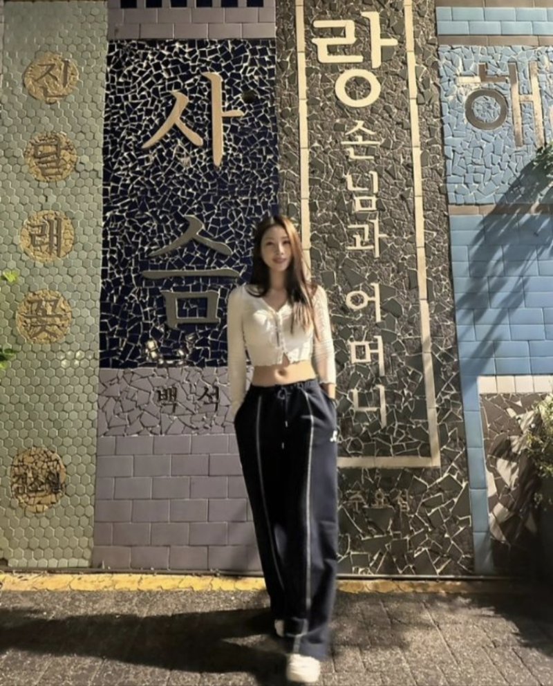 사진 속 신수지는 크롭 기장의 가디건에 헐렁한 추리닝 바지를 입은 모습이다.