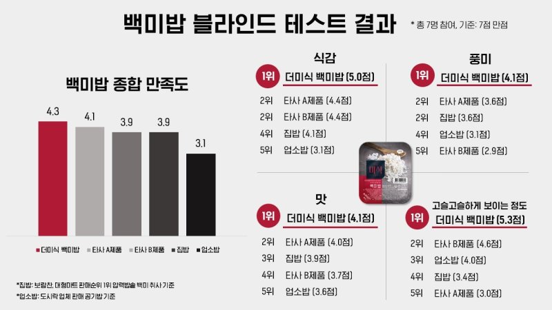 평가 결과, 더미식 백미밥은 종합만족도 항목 평균 평점 4.3점을 얻어 총 5개 제품 중 1위를 차지했다. 특히 종합만족도 항목에서 더미식 밥을 긍정적으로 평가한 비율이 57.1%로, 집밥(14.3%) 보다 약 4배 높게 평가됐다.