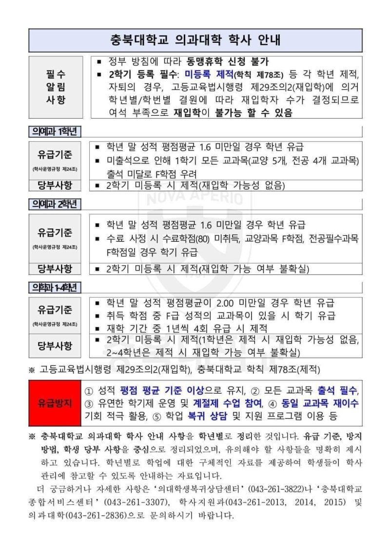 배포된 안내문에는 "정부 방침에 따라 동맹 휴학 신청이 불가능하다"며 "미등록 제적 등 각 학년 제적, 자퇴의 경우 고등교육법시행령 제29조의2(재입학)에 따라 학년별·학번별 결원에 따라 재입학자 수가 결정돼 여석 부족으로 재입학이 불가능할 수 있다"는 내용이 명시됐다.