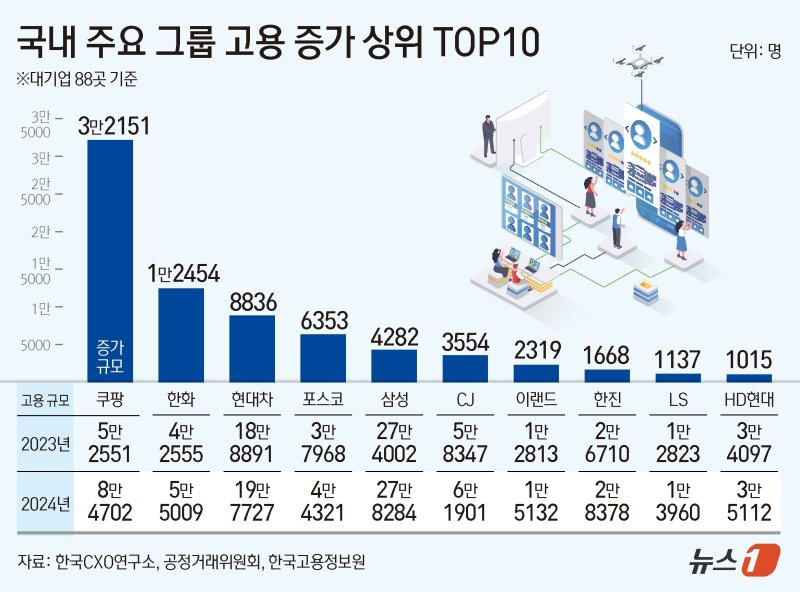 고용 인원이 가장 많이 증가한 그룹은 쿠팡이다. 2022년 5만 2551명에서 지난해 8만 4702명으로 3만 2151명 늘었다. 계열사인 쿠팡풀필먼트서비스가 1년 새 3만 명 이상 고용을 늘린 덕분이다.