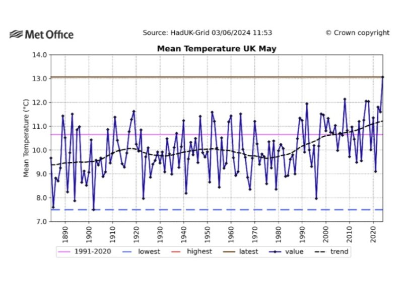 영국 기상청은 5월의 높은 평균 기온은 영국 북부의 따뜻한 날씨가 이어지고 밤 기온도 상승했기 때문이라고 분석했다.