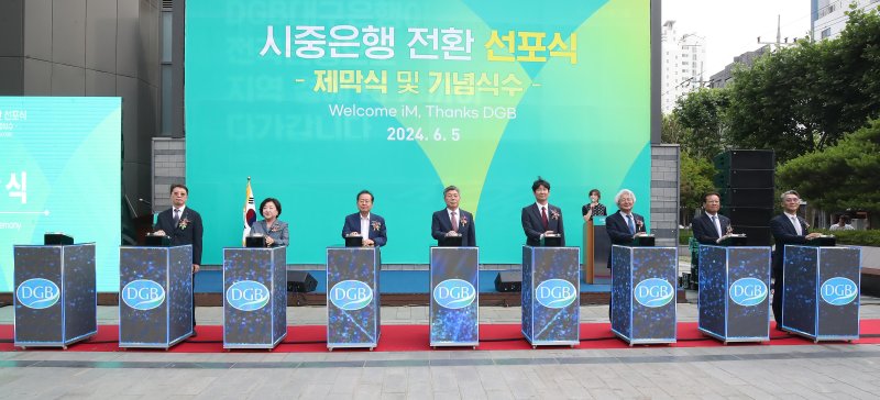 DGB금융그룹은 5일 수성동 제1본점에서 '그룹 NEW CI 선포식 및 시중은행 전환 선포식'을 갖고 'iM뱅크'로의 사명 변경을 공식 선언했다. iM은 기존 대구은행의 모바일 뱅킹앱 이름으로, '내 손 안에'란 의미다.