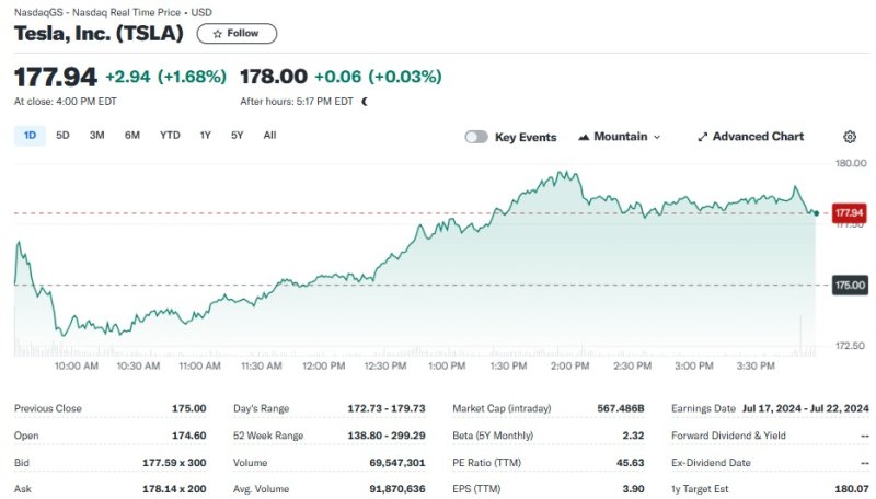 6일(현지시간) 뉴욕증시에서 테슬라는 전거래일보다 1.68% 상승한 177.94달러를 기록했다.