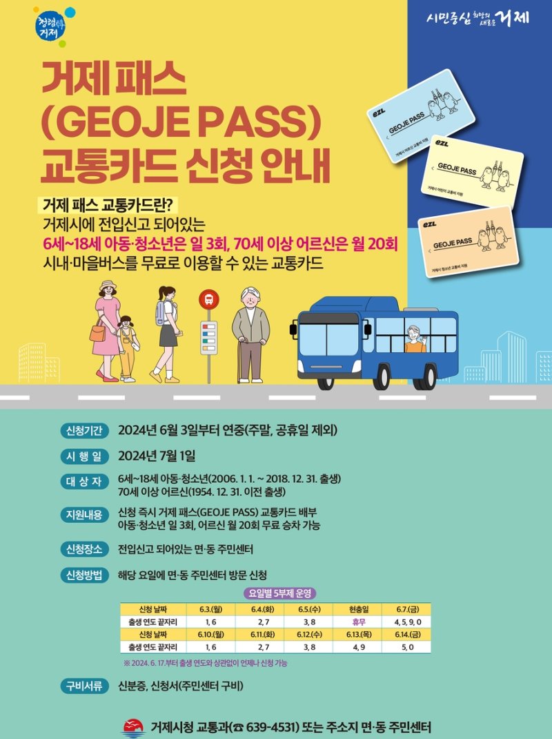 거제시, 7월부터 아동·청소년·어르신 시내버스 교통비 지원월 20회 무료 승차 '거제패스 교통카드' 지급