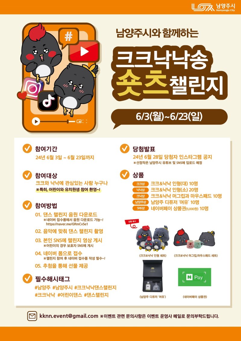 [남양주=뉴시스]이호진 기자 = 경기 남양주시는 시 홍보 캐릭터인 ‘크크’와 ‘낙낙’을 모티브로 만든 ‘크크낙낙송’의 안무를 따라하는 ‘크크낙낙송 숏츠 챌린지 이벤트’를 오는 23일까지 진행한다고 7일 밝혔다.