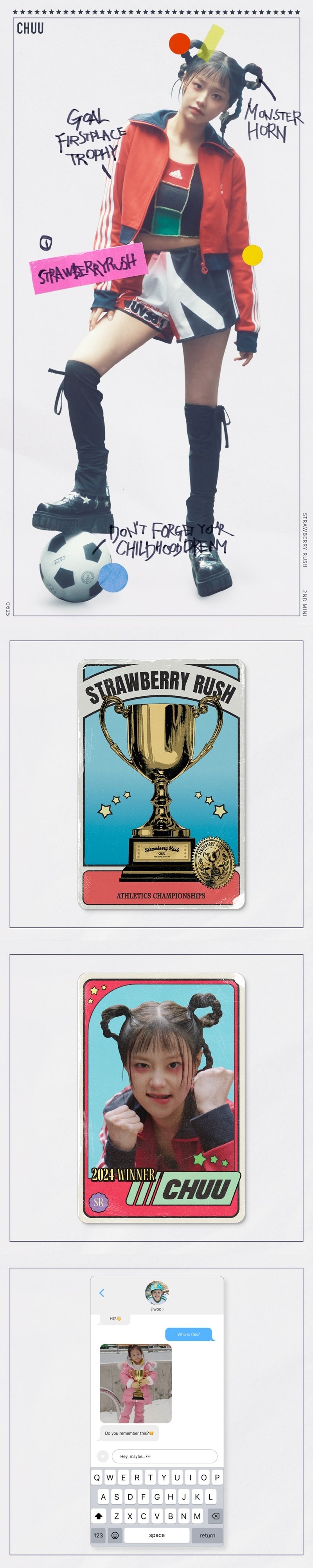 이어 공개된 포토 카드에는 레트로한 감성의 트로피 이미지와 권투를 하듯 두 주먹을 불끈 쥔 포즈에 장난기 어리지만 비장한 각오가 전해지는 츄의 얼굴이 클로즈업된 사진이 디자인되어 있다. 특히 함께 공개된 트로피를 두 손으로 쥐고 있는 어린 여자 아이의 모습이 담긴 의문의 인스타그램 DM 화면은 앞서 공개된 메인 터저 속 키워드와 연장선을 이루며 '스트로우베리 러시'를 통해 펼쳐질 음악 세계와 그 안에 담긴 서사는 무엇일지 관심이 집중된다.